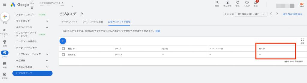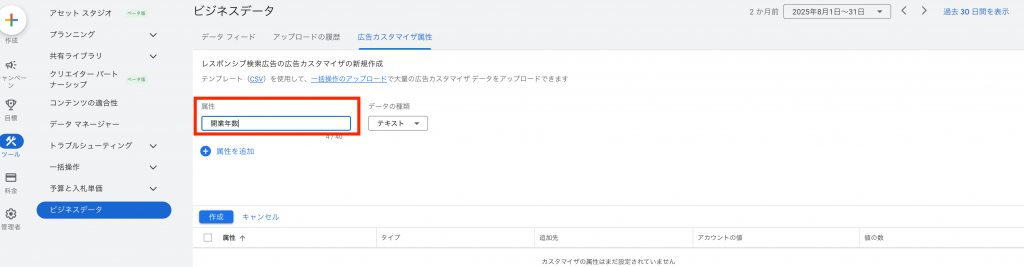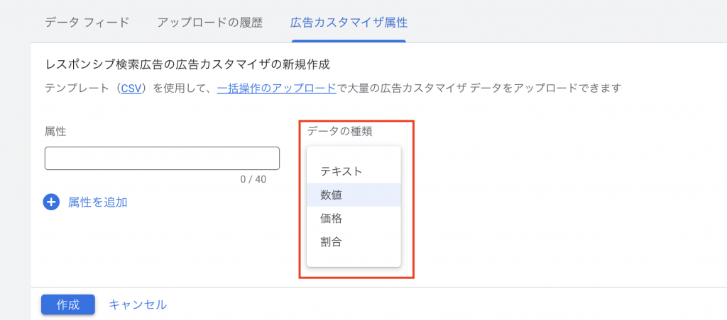 設定方法として、まず Google広告の管理画面で「カスタマイザ属性」というデータを登録します。