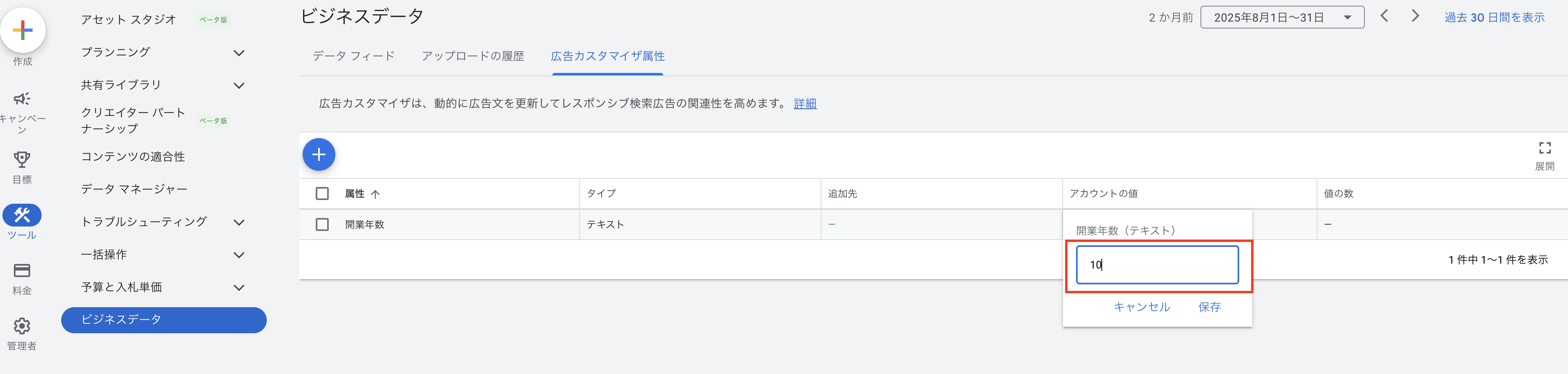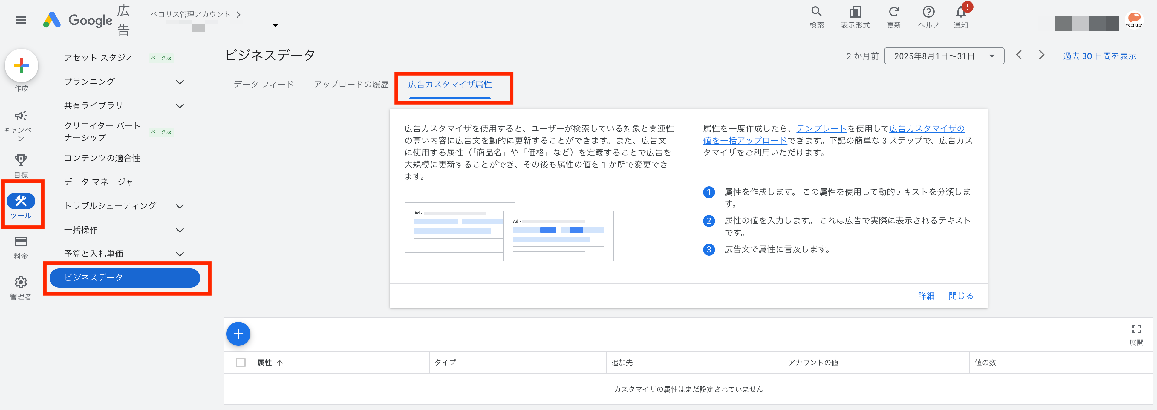 「ツール」→「ビジネスデータ」→「広告カスタマイザ属性」と選択します。