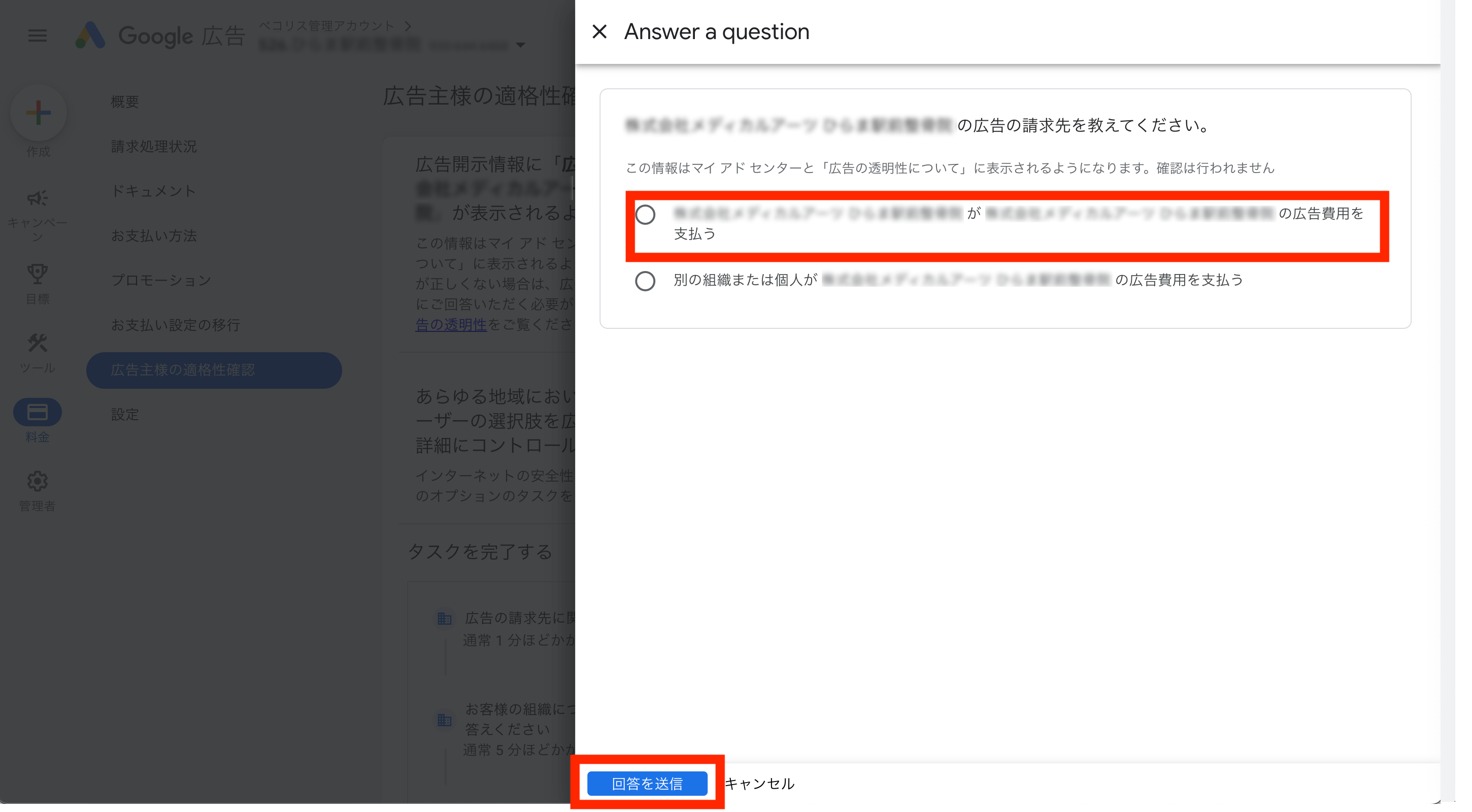 ここでは広告の請求先を質問されます。基本的には「自社で広告費を支払う」ことが多いと思いますので、そちらを選択し、「回答を送信」をクリックします。これで1つ目のタスクが完了になります。