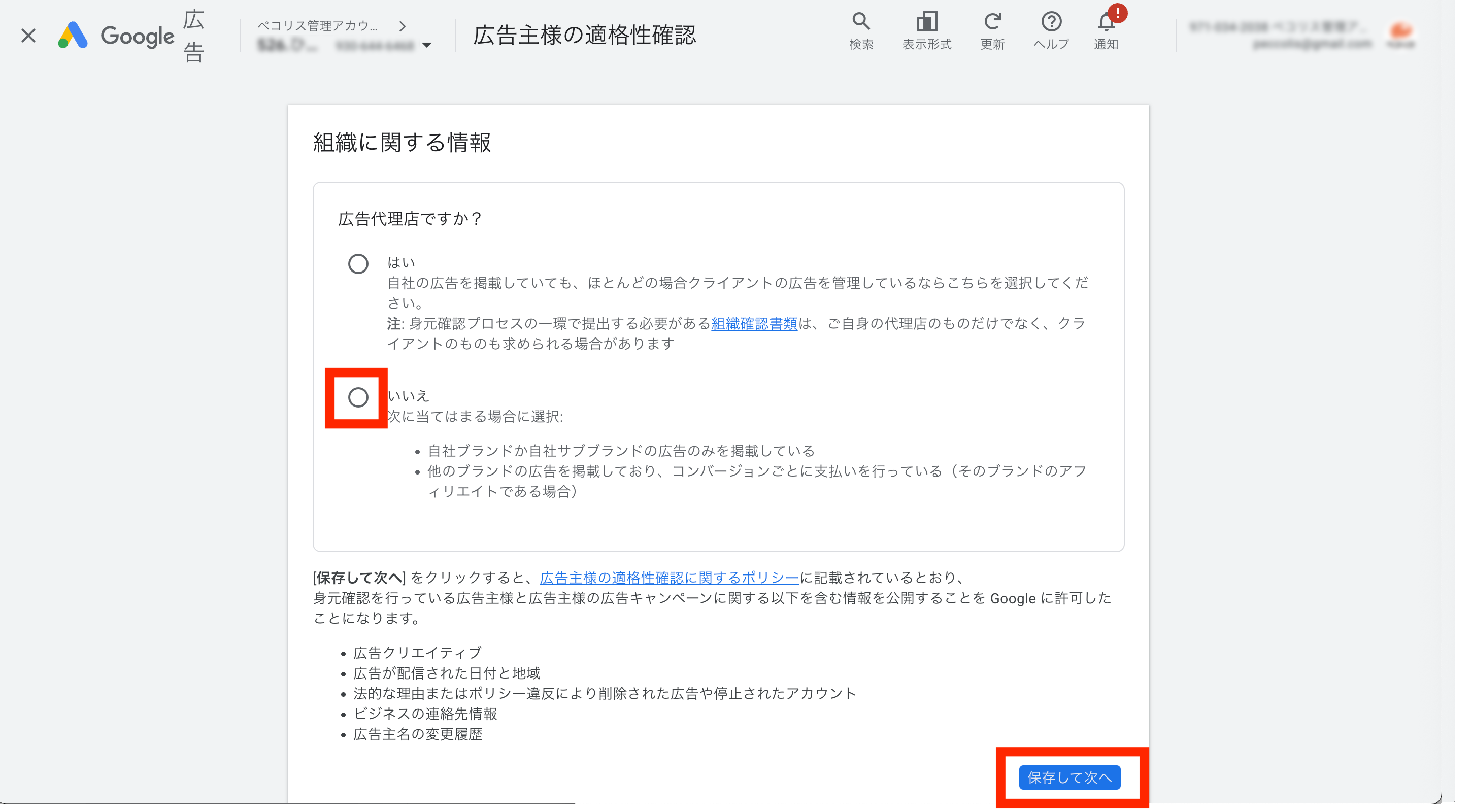 続いて、「タスクを完了する」項目から「お客様の組織について、いくつかの質問にお答えください」へ進みます。ここでは「広告代理店ですか?」と質問され、広告代理店でなければ「いいえ」を選択し、「保存して次へ」を選択します。