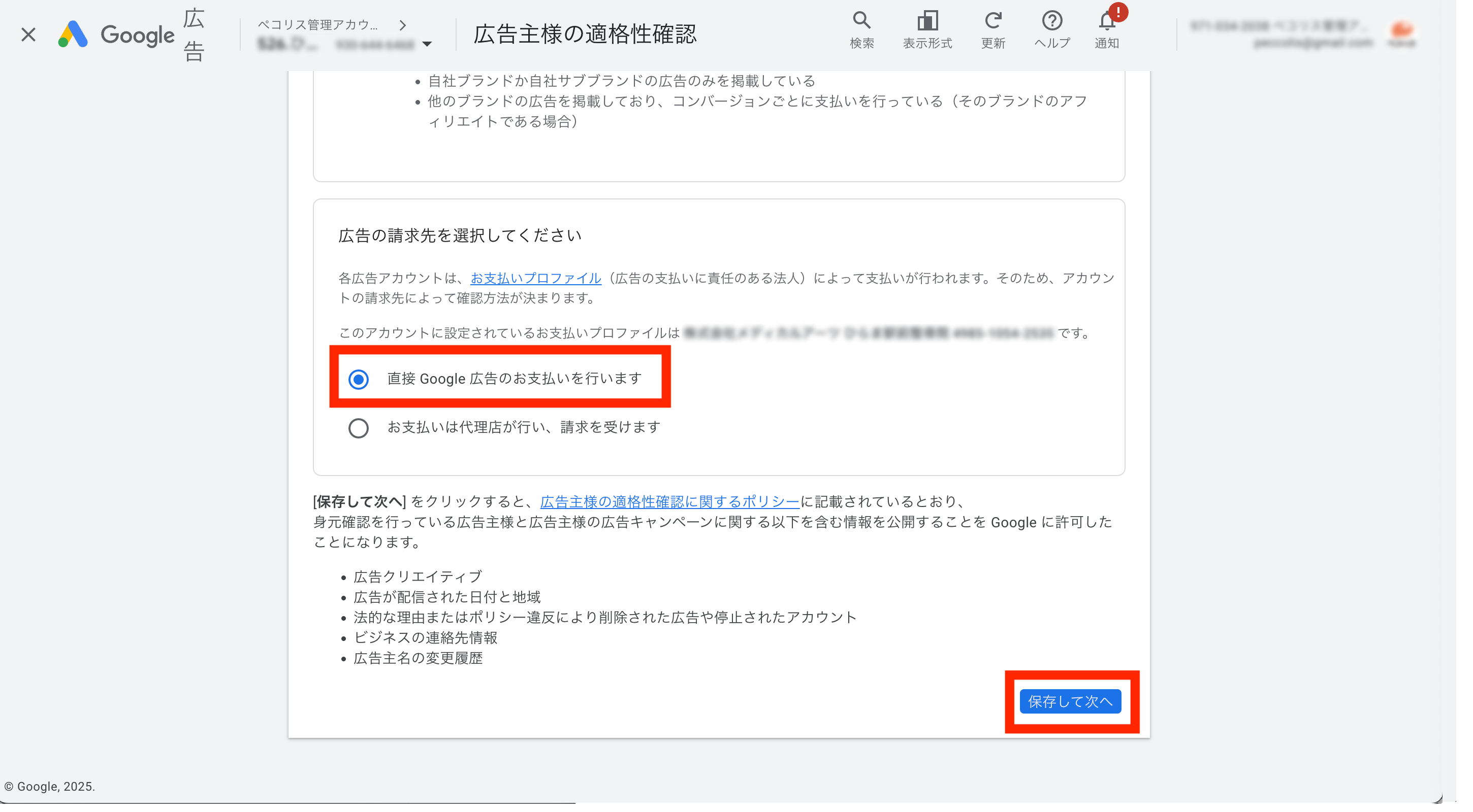 「広告の請求書先を選択してください」の項目に移ります。ご自身でGoogle広告の広告費を支払っている場合は「直接Google広告のお支払を行います」を選択し、「保存して次へ」を選択します。これで2つ目のタスクが完了です。