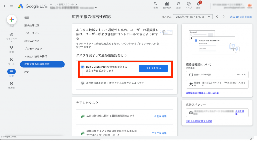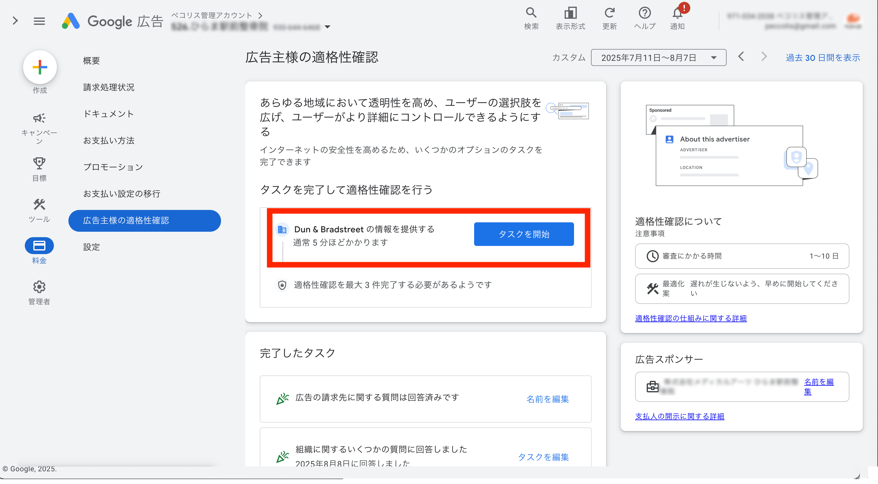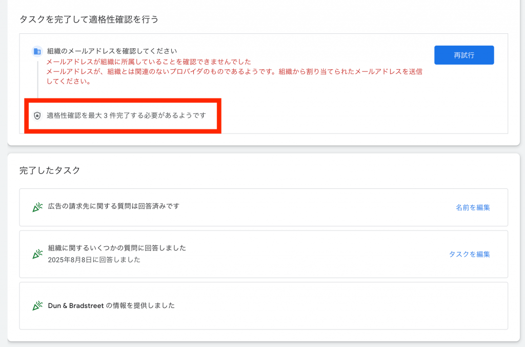 Google広告の管理画面にも「適格性確認を最大3件完了する必要があるようです」と表示されており、ここまで行った「広告の請求に関する質問」、「お客様の組織についての質問」、「Dun & Bradstreet の情報提供」の3つのタスクが完了していれば、あとは待っているだけで適格性確認が完了する仕組みになっているのです。
