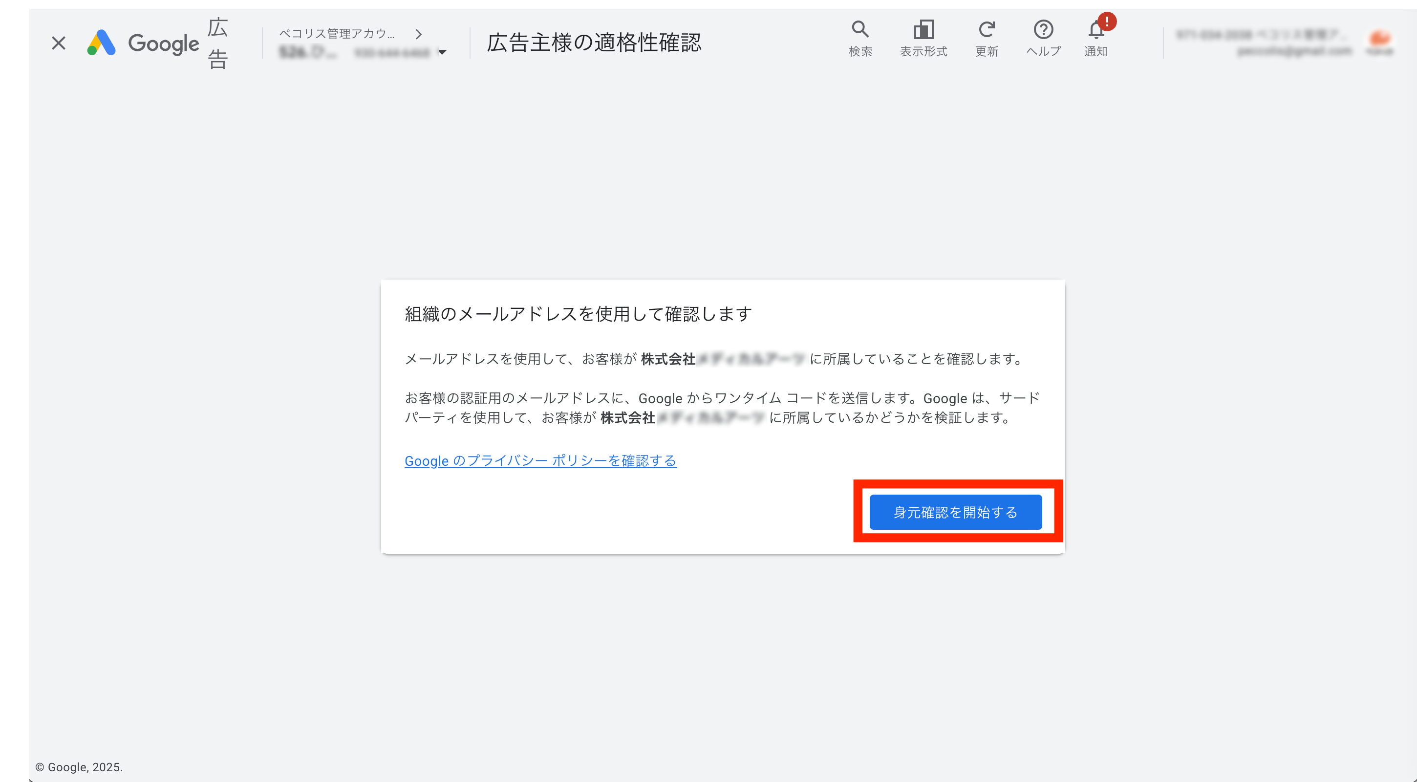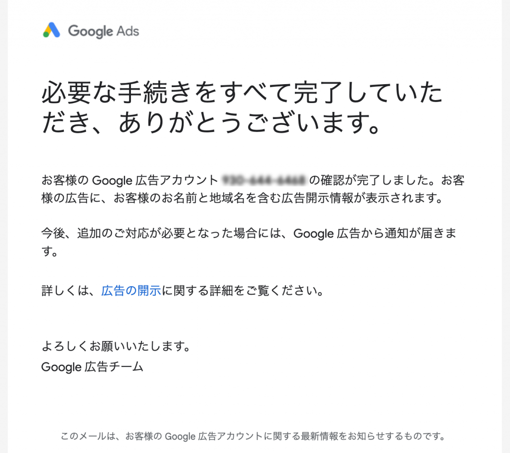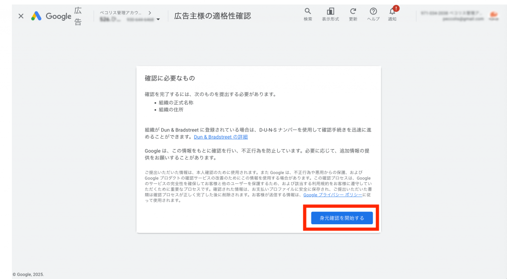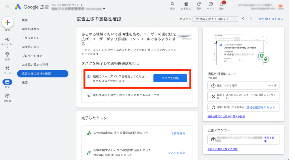 完了までには1日から最大10日ほど時間がかかる場合があるので、しばらくお待ちください。また、以前は身元確認のために免許証や法人の登記簿謄本の提出が求められることもありましたが、最近では提出が求められないケースも出てきています。Googleに確認したところケースバイケースとのことですが、登記簿謄本などの提出なしで適格性確認が完了できるようになったのは、手続きが簡素化され非常にありがたいポイントと言えるでしょう。