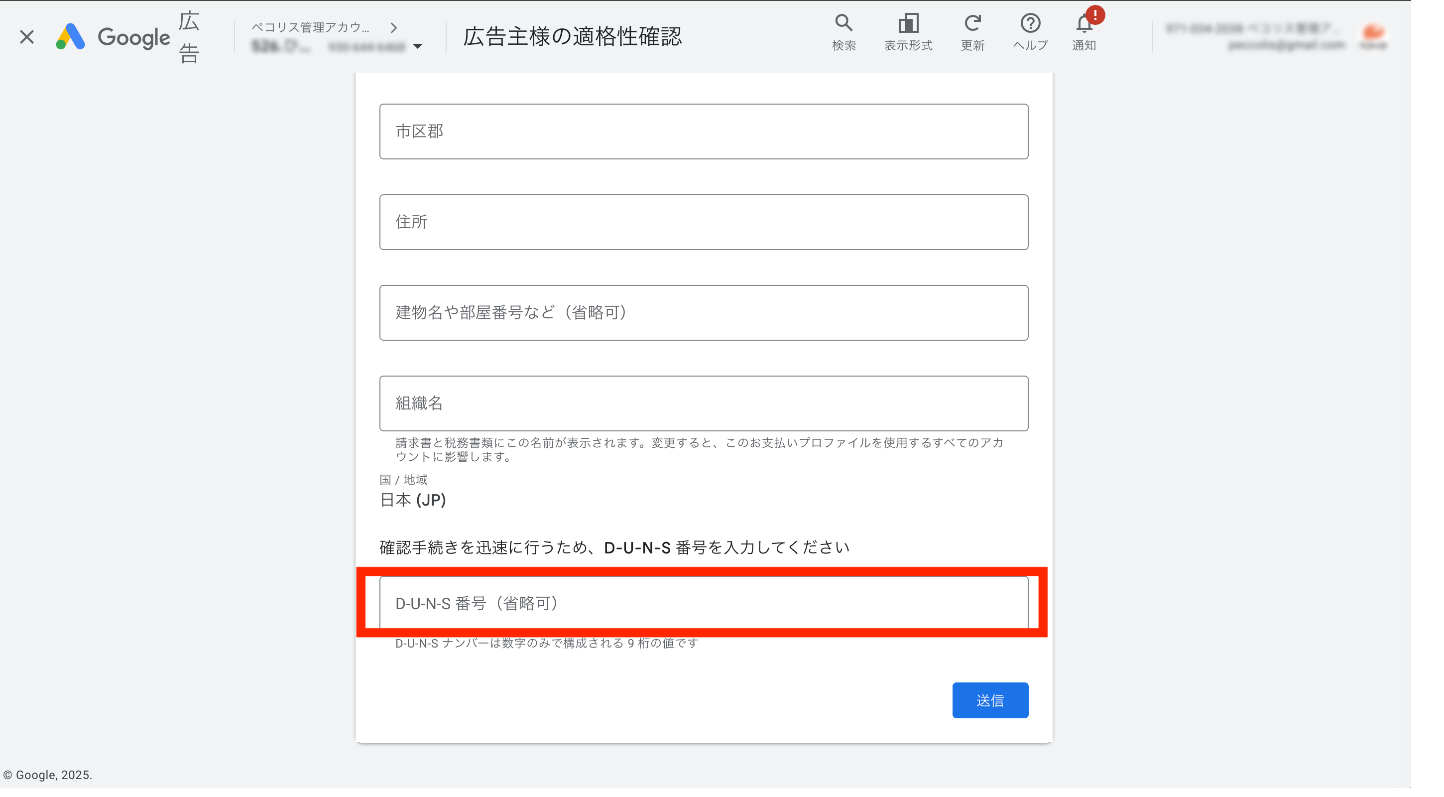 会社名や住所などの入力項目に入力します。最後のD-U-N-Sナンバーは省略可能なので、持っていなければ空欄のまま「送信」をクリックしましょう。これで3つ目のタスクが完了になります。