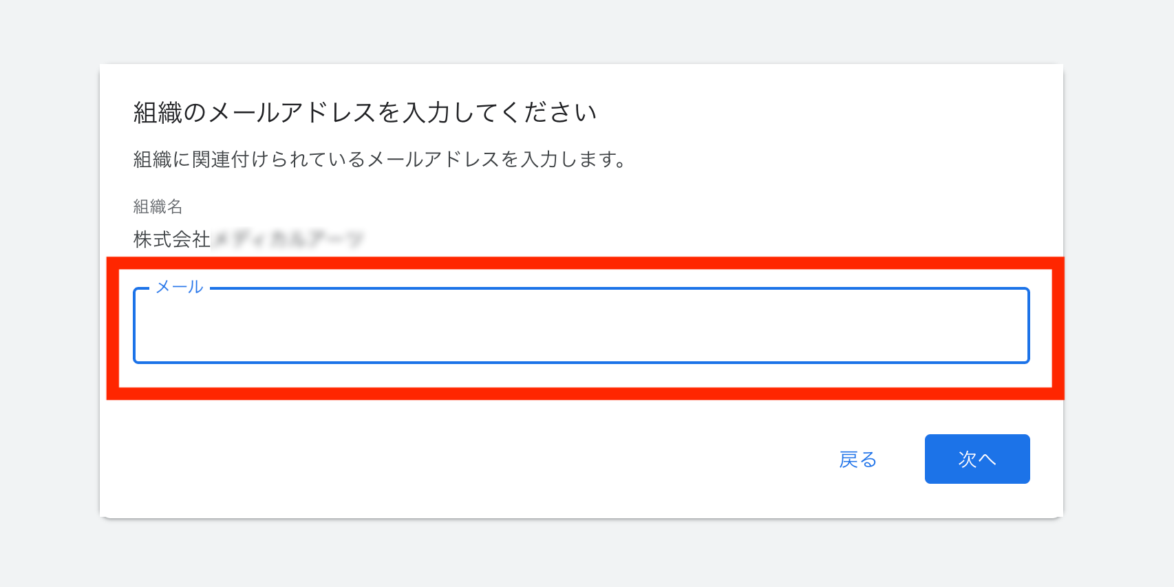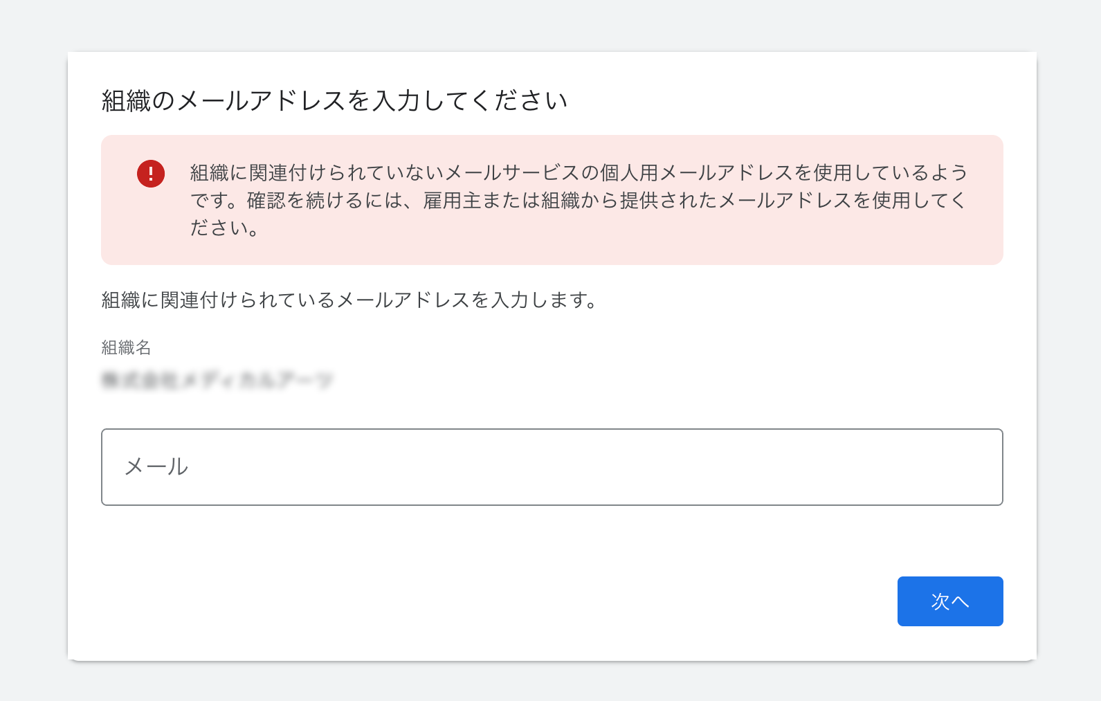 メールアドレスの入力欄が現れます。ここに会社のメールアドレスを入力し、送信されたコードを入力して確認を行うという流れです。