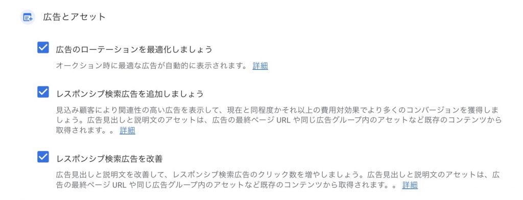 現在では、ほぼ拡張テキスト広告だけしか出していない、という人はいないと思いますが、拡張テキスト広告だけという人の場合はレスポンシブ検索広告を自動で追加してくれます。
