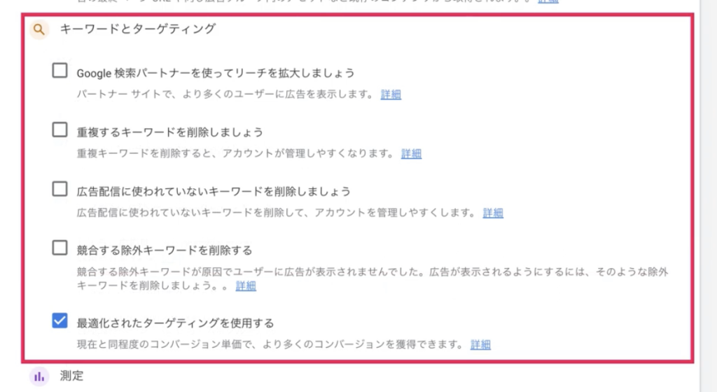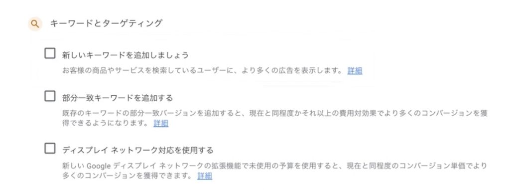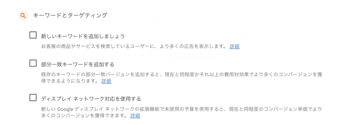 最近Googleでは「部分一致でのキーワード登録」を推奨しています。コンバージョンが毎月10~15件以上をしっかりと獲得できていて、なおかつどういうキーワードがコンバージョンにつながっているのか、AIがしっかりと学習できている状態であれば適用を考えても良いでしょう。部分一致でうまく成果が出ている場合も見受けますが、部分一致に頼り過ぎると無駄なクリックが激増する可能性も否定できません。検索クエリの管理ができない状態など闇雲にチェックを入れるのであれば、無駄なワードが発生してしまうことも考えられるので、ここはチェックを入れないようにします