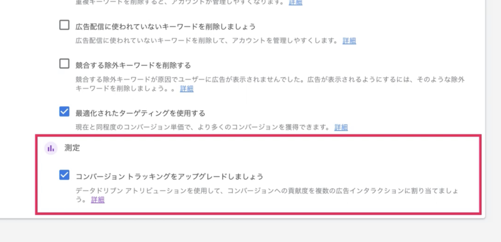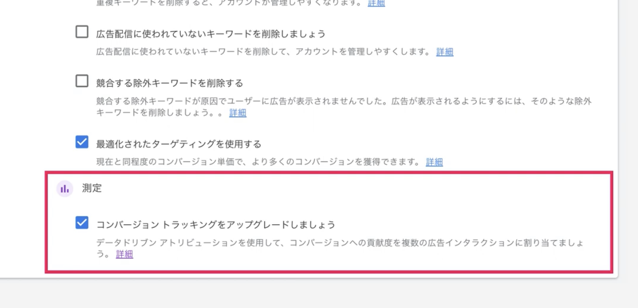 以前は「接点ベース」「ラストクリック」などありましたが、Google広告内部のアップグレードに伴って、その都度コンバージョントラッキングの方式も変わってきています。ここはそれに伴って自動的にアップグレードされる方がいいでしょう。
