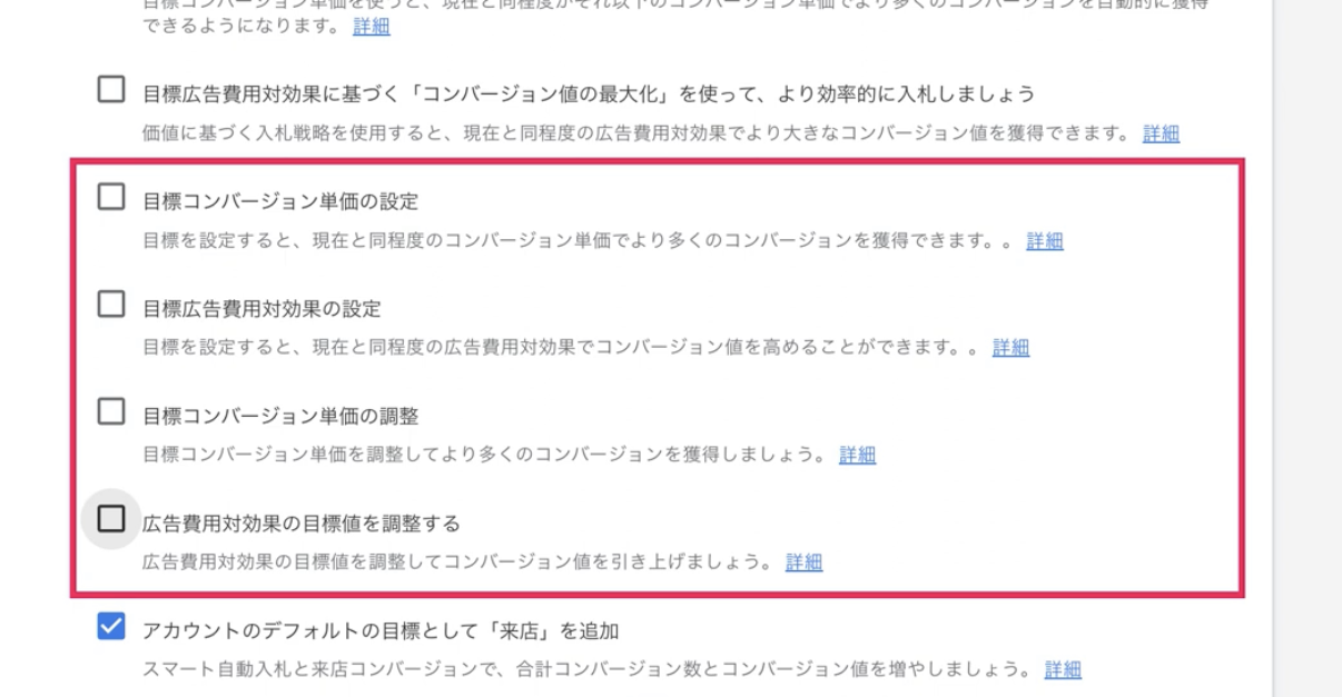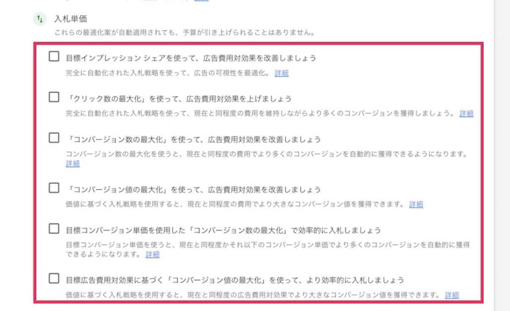 その下の赤枠内の4項目についてはチェックは入れなくて大丈夫です。すでに入札戦略で設定していて、最適化案が同じ内容であればチェックを入れても構いませんが、いずれにしてもすでに設定しているので新しく設定する必要はないでしょう。