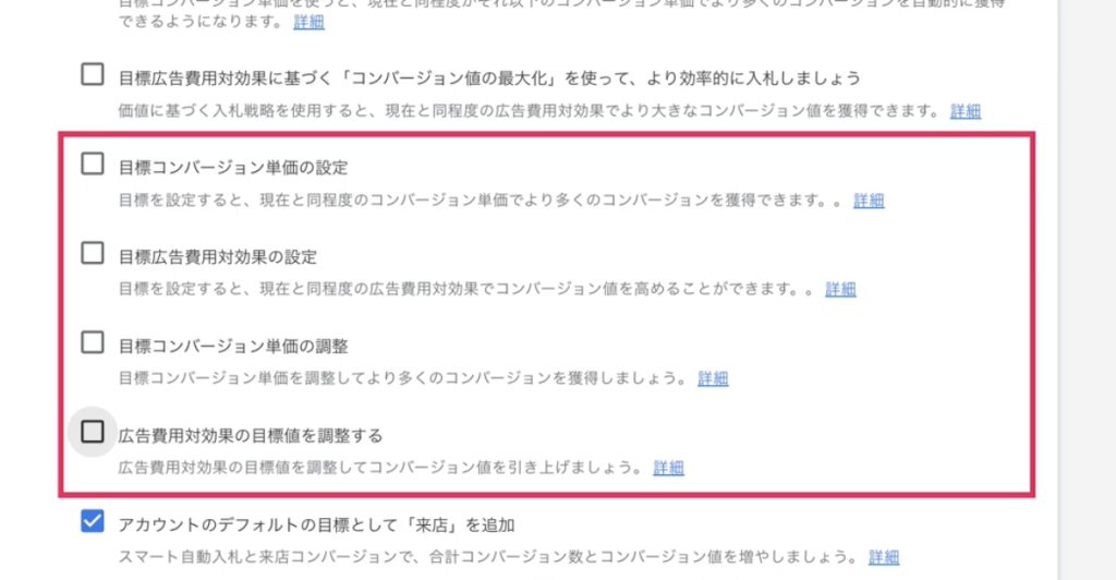 赤枠内はすべて入札単価に関する内容です。どんな入札単価を設定しているかによります。同じものであればチェックを入れて良いでしょう。ただ「違う入札単価を導入する」にチェックを入れてしまうと、自動的に入札単価が変更されてしまう恐れがあるので選択する際には注意してください。