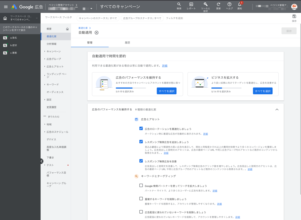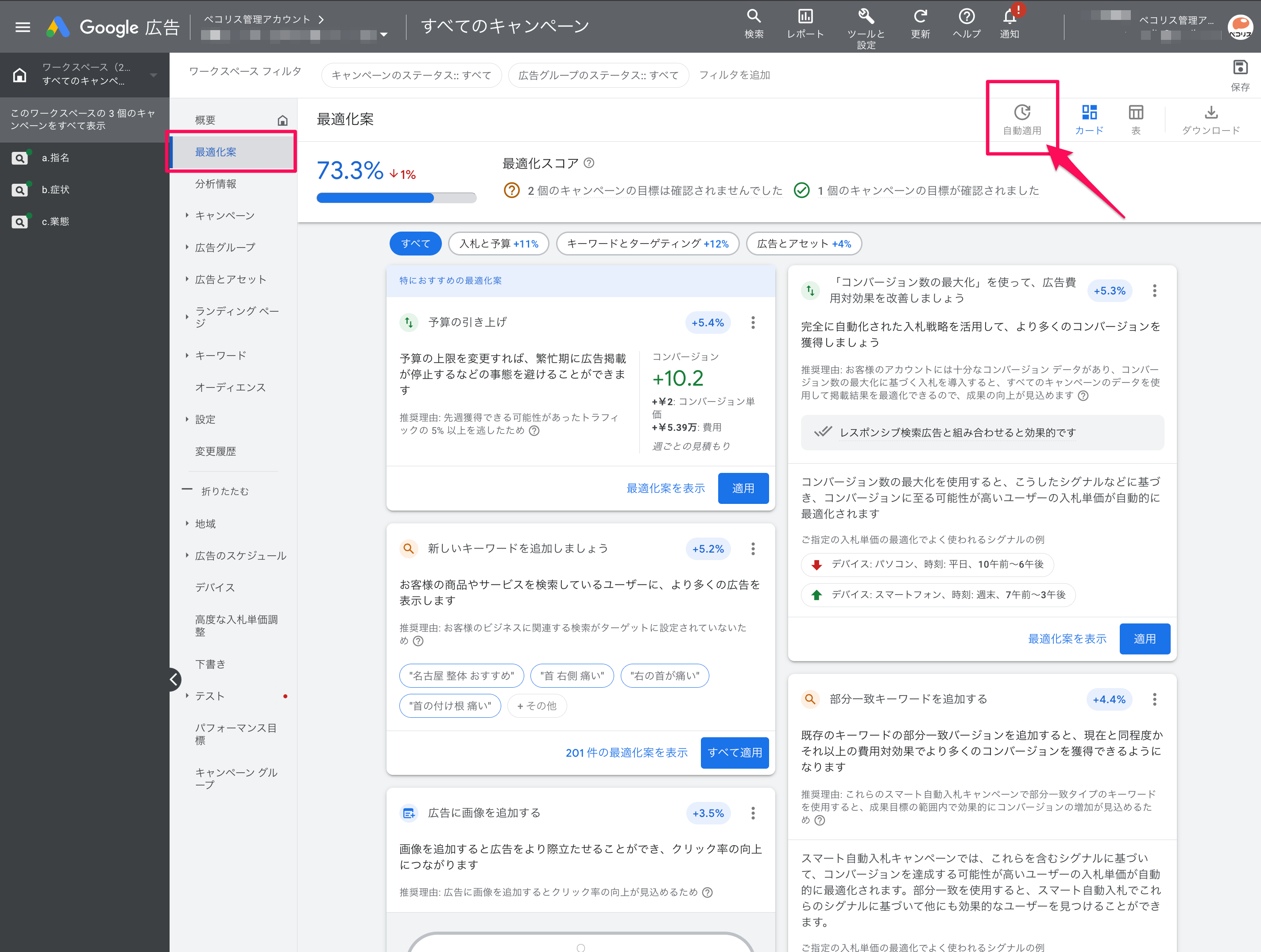 現在の広告を良い状態に保ち、しっかりと守るための最適化案です。