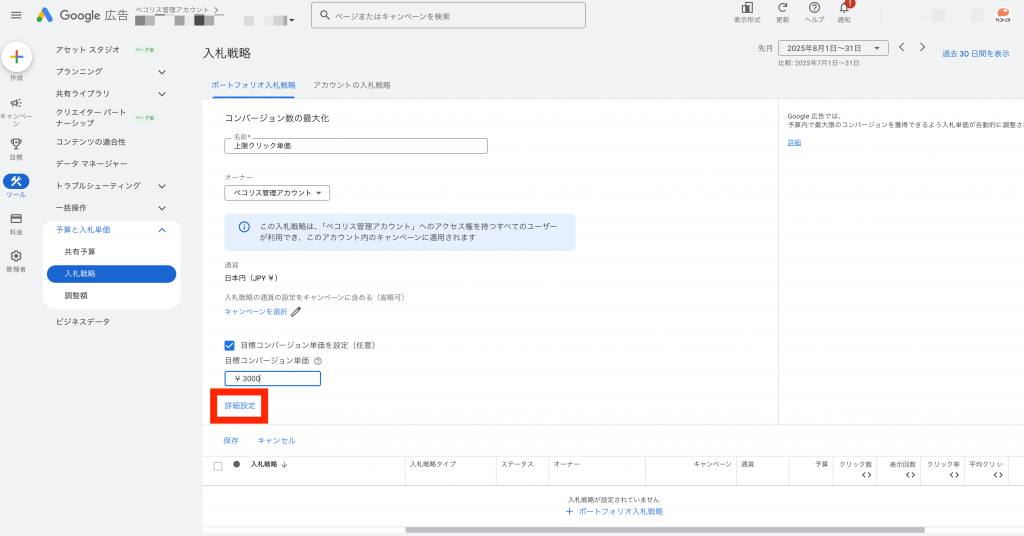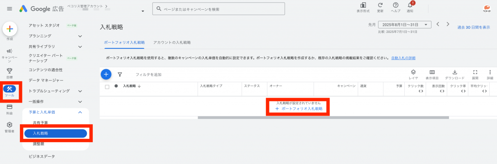Google広告の管理画面で「ツール」→「入札戦略」をクリックし、「ポートフォリオ入札戦略」をクリックします。