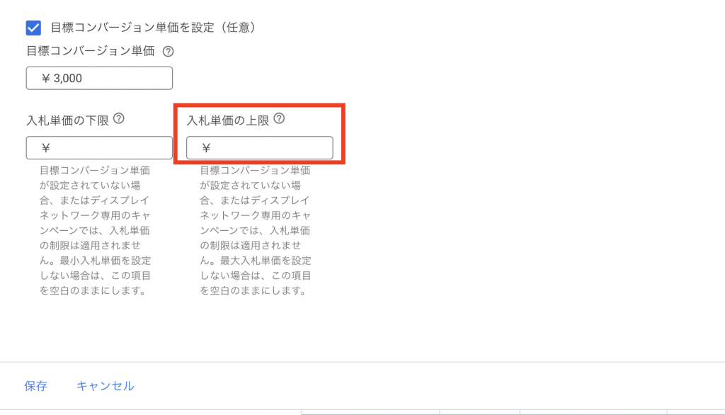 下限クリック単価と上限クリック単価を設定する画面が現れ、こちらでクリック単価を設定することが可能です。