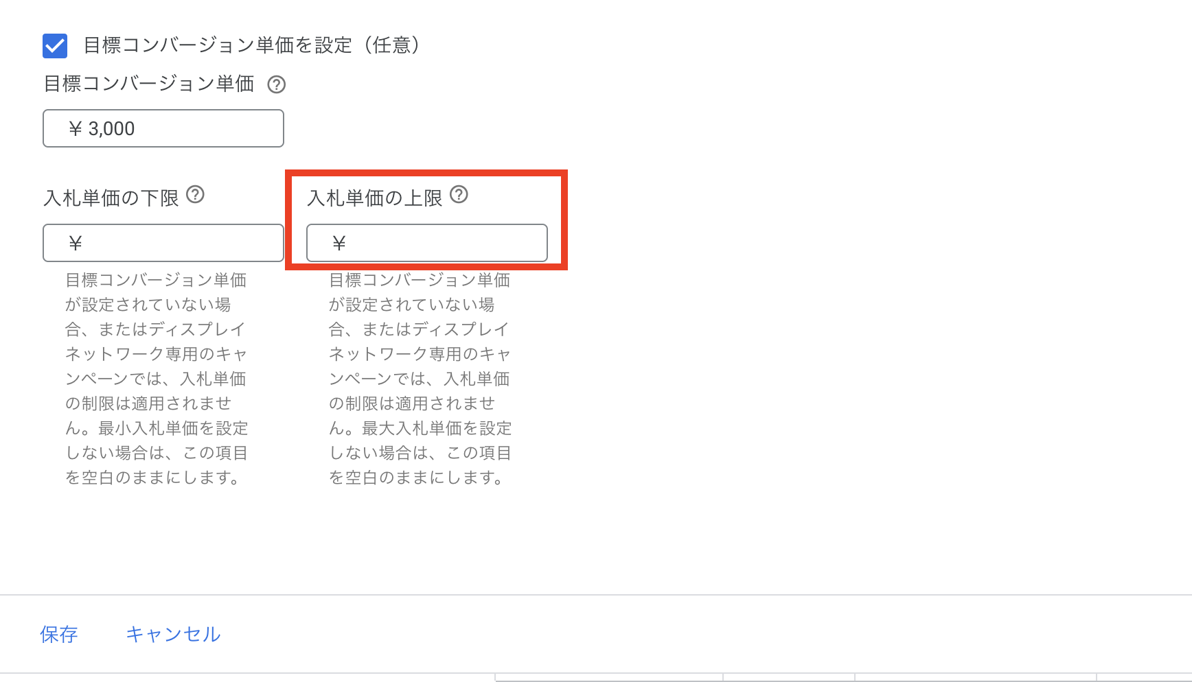 下限クリック単価と上限クリック単価を設定する画面が現れ、こちらでクリック単価を設定することが可能です。