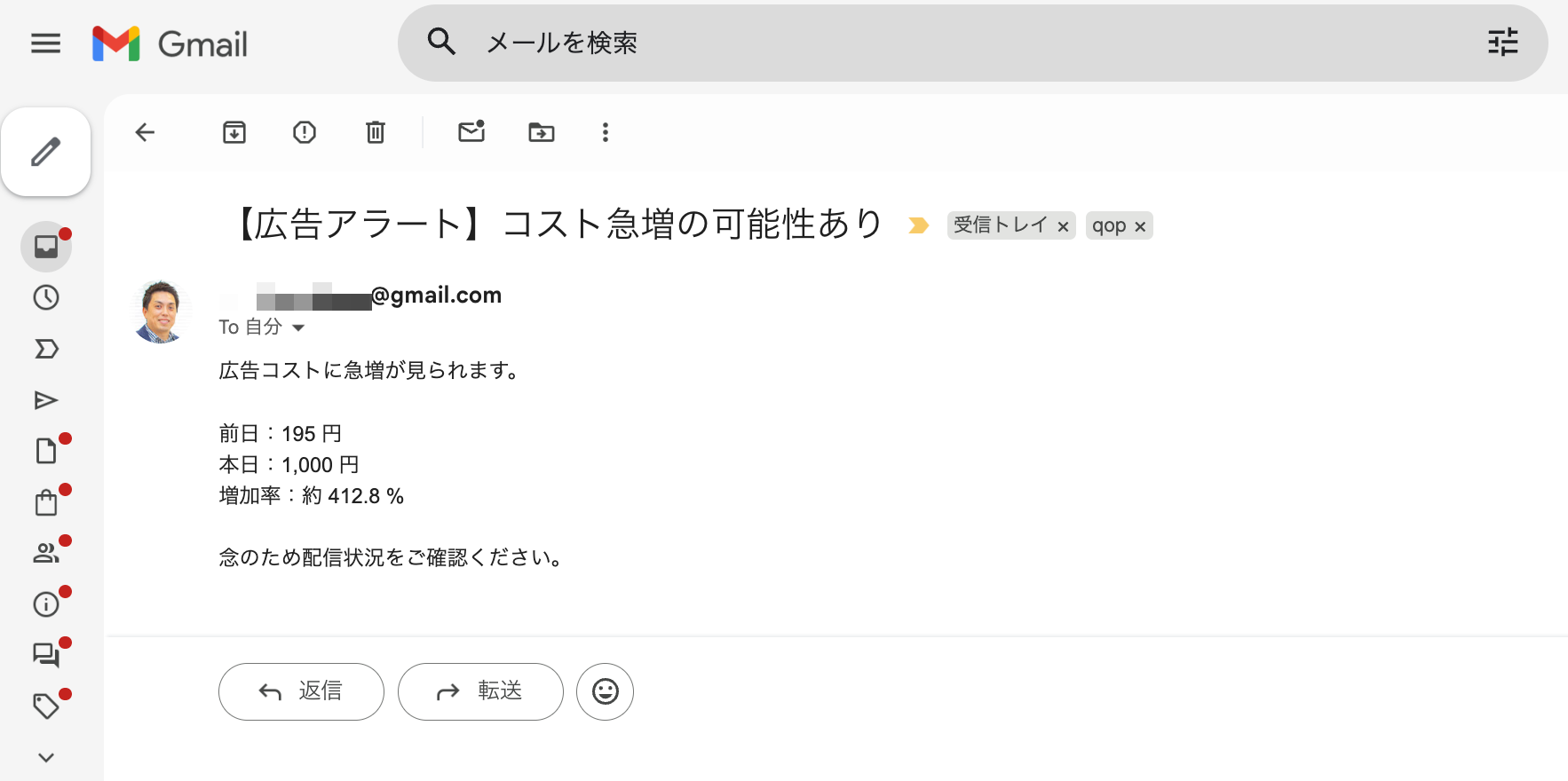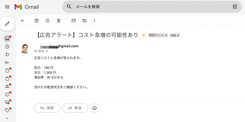 このコードは、前日と当日の広告コストを比較し、急増していた場合にメールで通知する内容になっています。