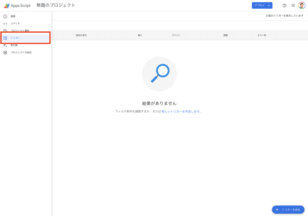 画面左側の「トリガー」をクリックし、トリガーを追加します。
