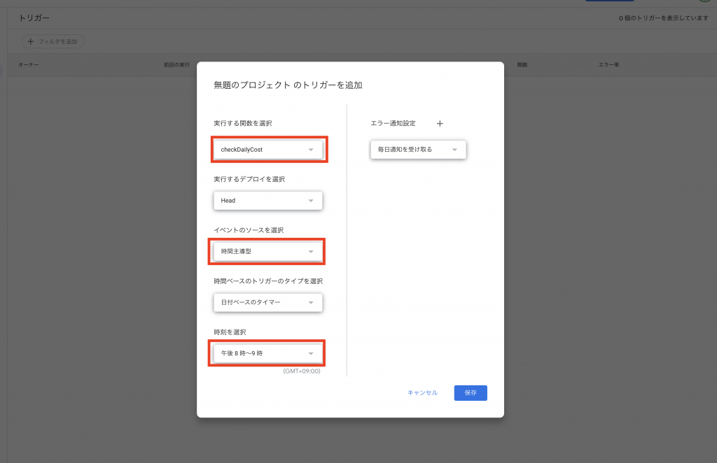 イベントの種類は「時間主導型」、実行のタイミングは「毎日朝9時」など、任意の時間を設定してください。
