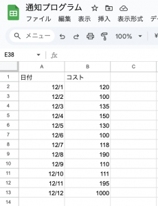 スプレッドシートに「日付」と「広告コスト」を並べ、その数値をGASでチェックします。広告コストの入力は手作業でも問題ありませんし、別の仕組みで自動取得しても構いません。
