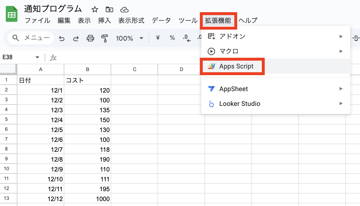 A列に日付、B列に広告コストを入力し、上部メニューの「拡張機能」から「Apps Script」を開きます。