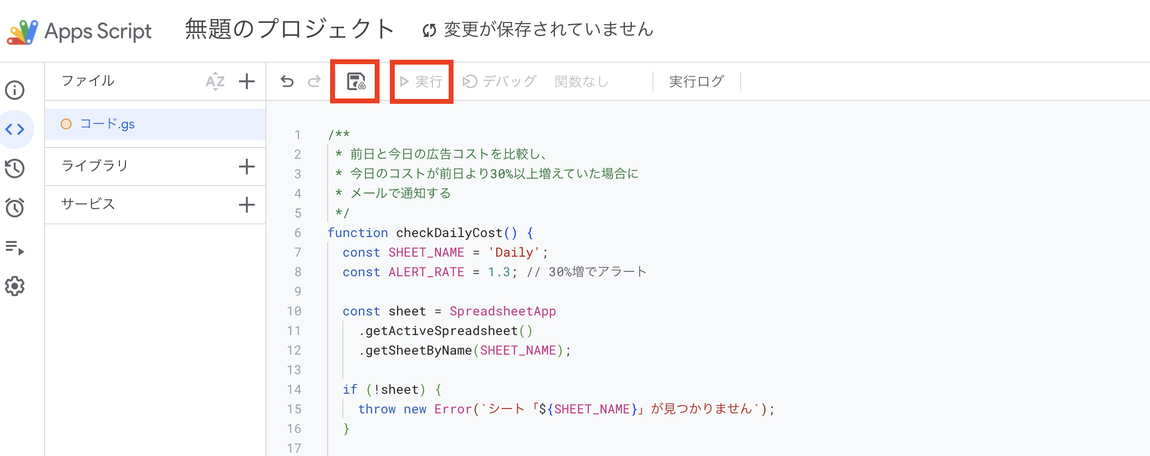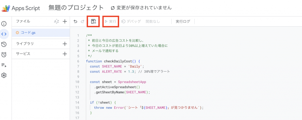 コードを貼り付けたら保存し、実行ボタンをクリックします。