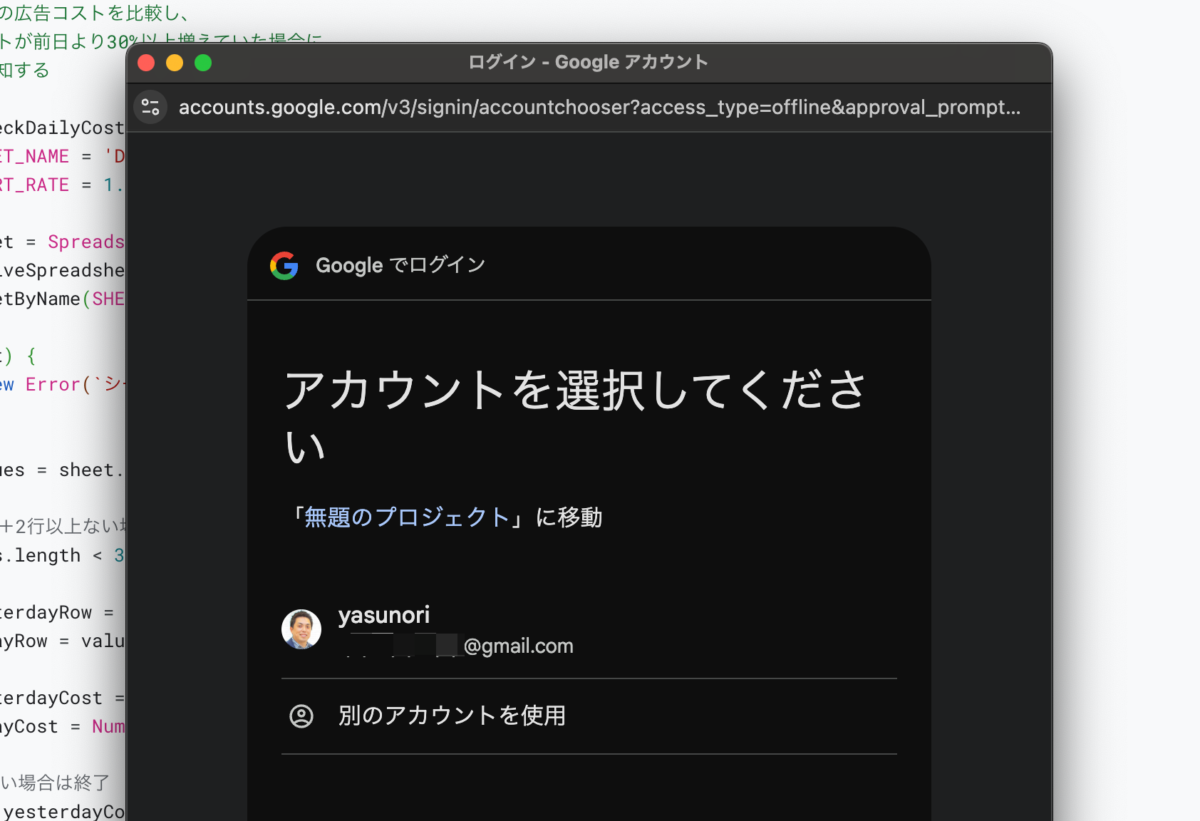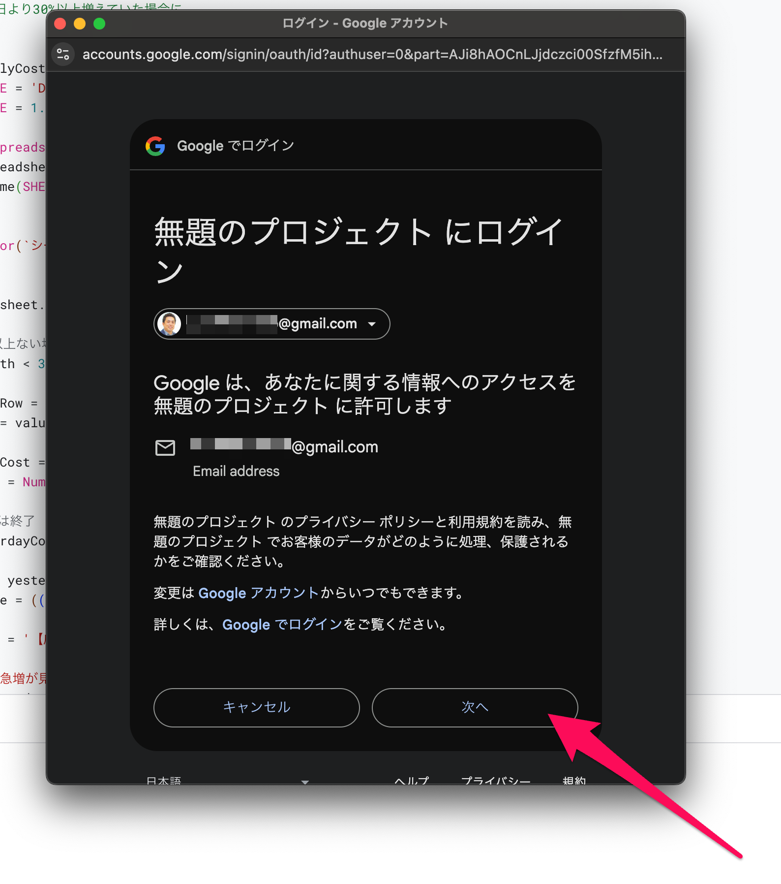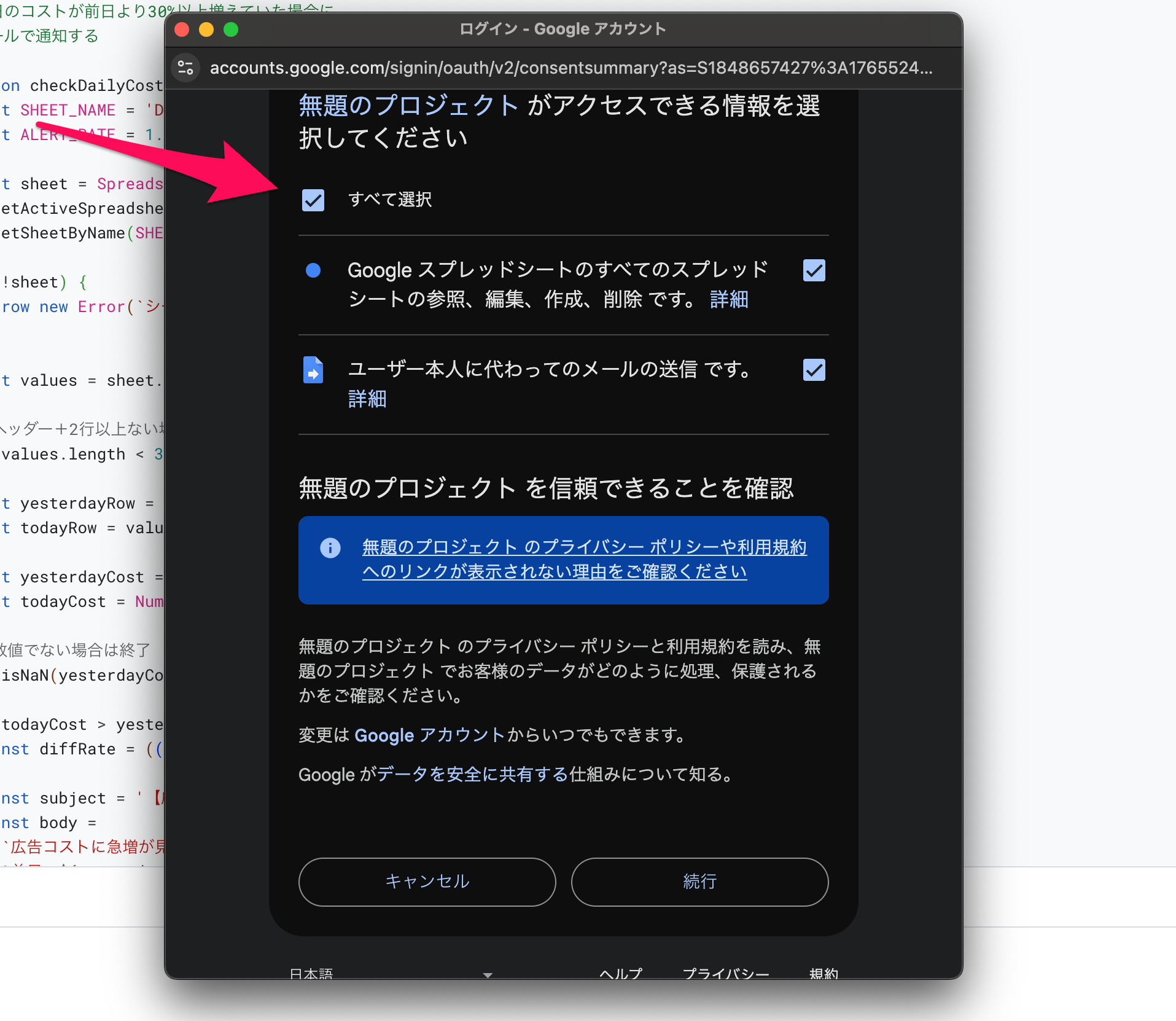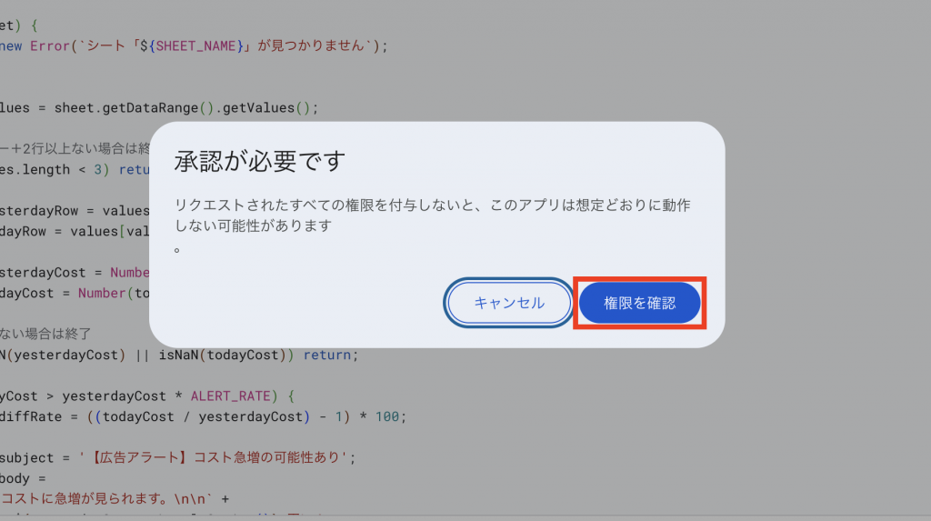 初回実行時には、権限の確認画面が表示されます。「権限を確認」をクリックします。