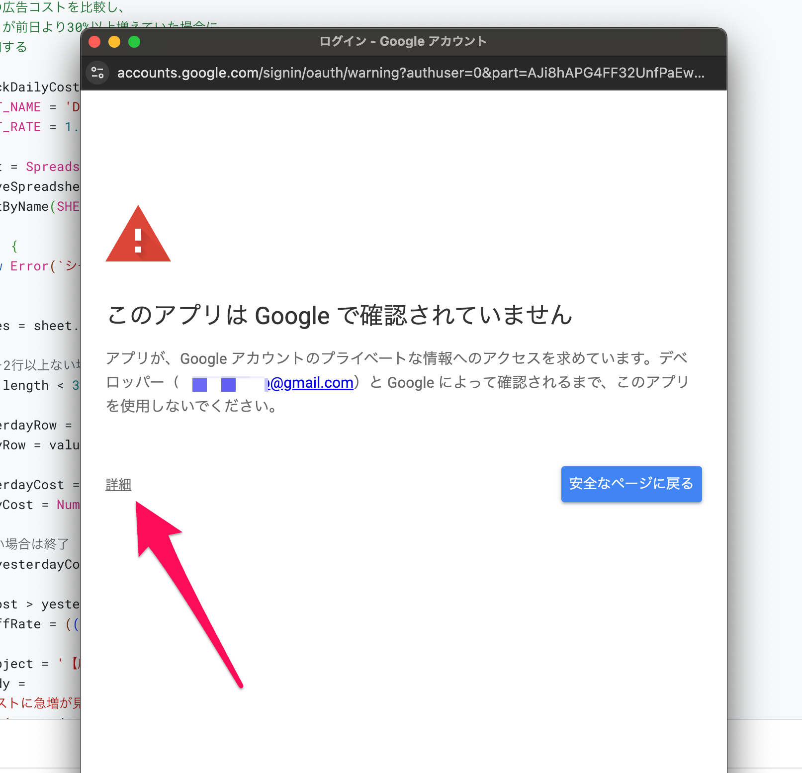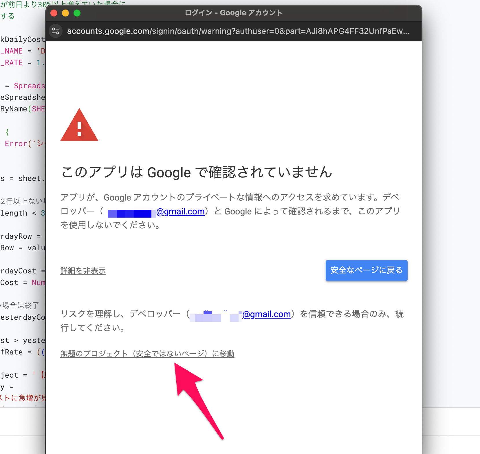 「詳細」→「無題のプロジェクト(安全ではないページ)に移動」をクリックします。