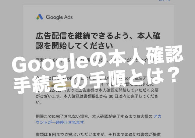 まず、グーグル広告より「広告配信を継続できるよう、本人確認を開始してください」というタイトルのメールが届きます。このメールが届きましたら、「広告主様の適格性確認プログラム」の対象に選ばれたということになります。